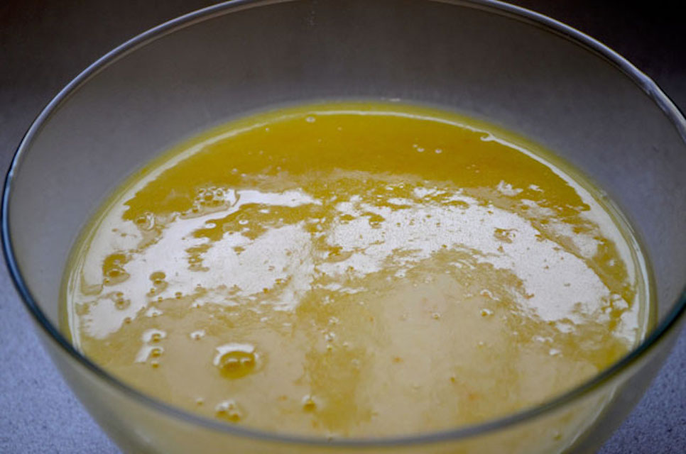 Nel frattempo preparate la crema. In un pentolino battete le uova con lo zucchero e la scorza d'arancia. Poi aggiungete il succo d'arancia e mescolate ancora. Mettete il pentolino sul fuoco e aggiungete il burro e mescolate. Appena la crema inizia a sobbollire, continuate a mescolare ancora per 1min. Dopo togliete dal fuoco e fatela raffreddare. La crema non diventerà solida ma rimarrà abbastanza liquida...