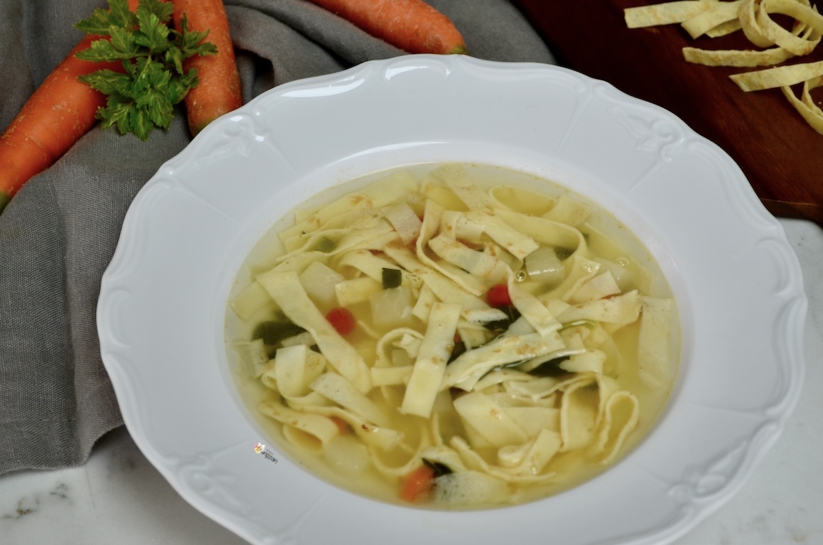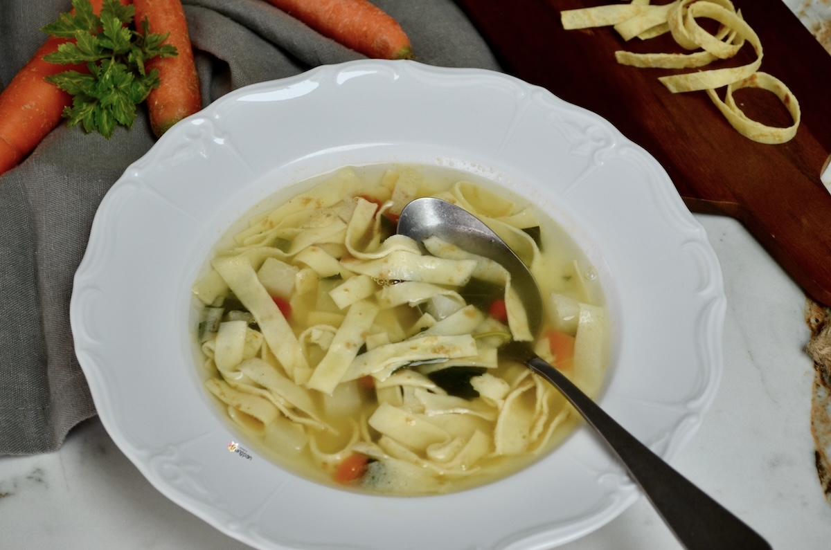 Dieses Gericht erinnert mich sehr an eine mir sehr liebe Person, Santina! Als wir jünger waren und uns öfter trafen, hat sie oft Flädlisuppe gekocht. Vielleicht kamen wir vom Schlittschuhlaufen oder Schlitteln zurück und brauchten etwas Warmes. Es ist nichts Besonderes, eigentlich nur eine Brühe mit in Streifen geschnittenen Crêpes, mehr nicht. Aber ich kann euch versichern, es ist wirklich köstlich! Dieses Gericht wird oft als Vorspeise serviert, aber ich persönlich liebe es als Hauptgericht. Es lässt sich gut vorbereiten und bei Bedarf wieder aufwärmen. Wenn ihr es als Vorspeise serviert, rechnet mit einer Crêpe pro Person und einem Suppenteller Brühe. Wenn ihr es zum Mittag- oder Abendessen serviert, erhöhen sich die Mengen natürlich.
