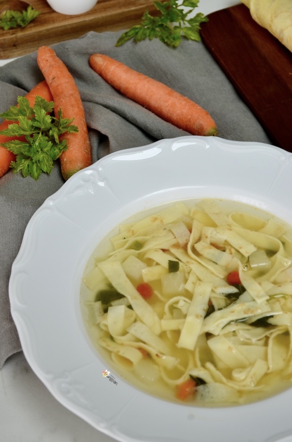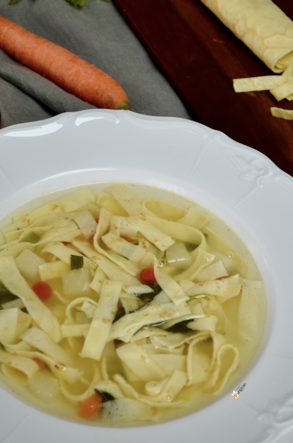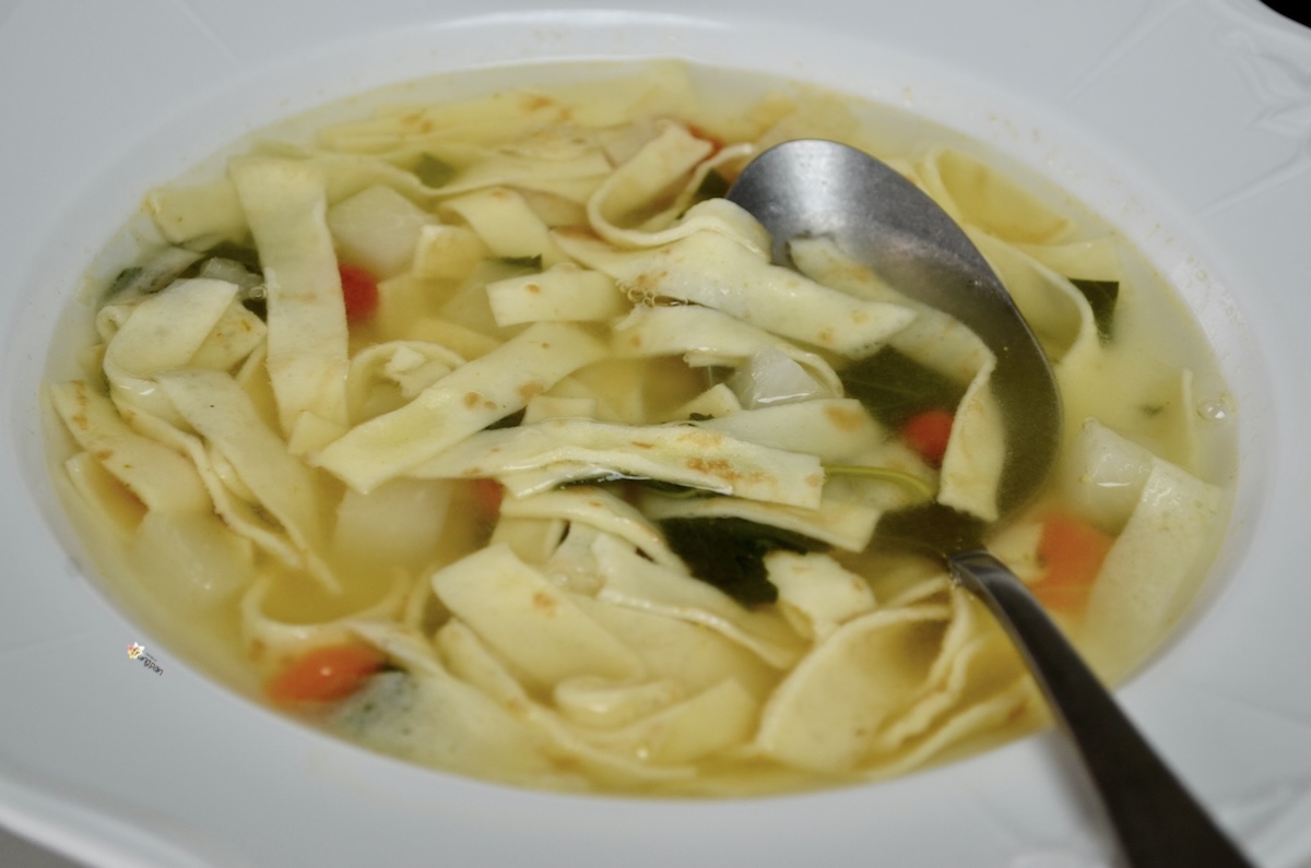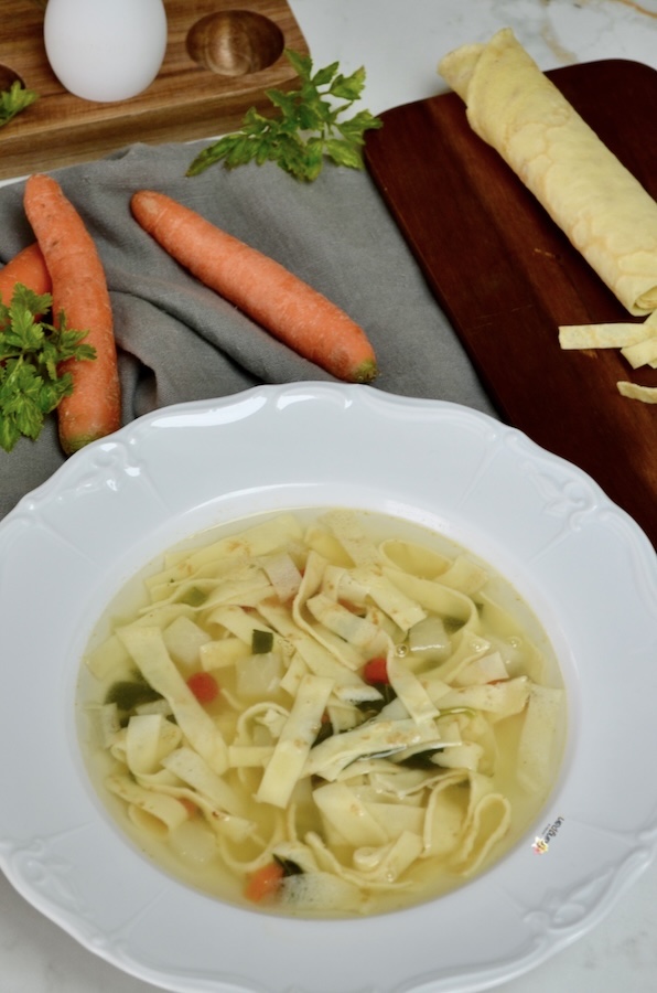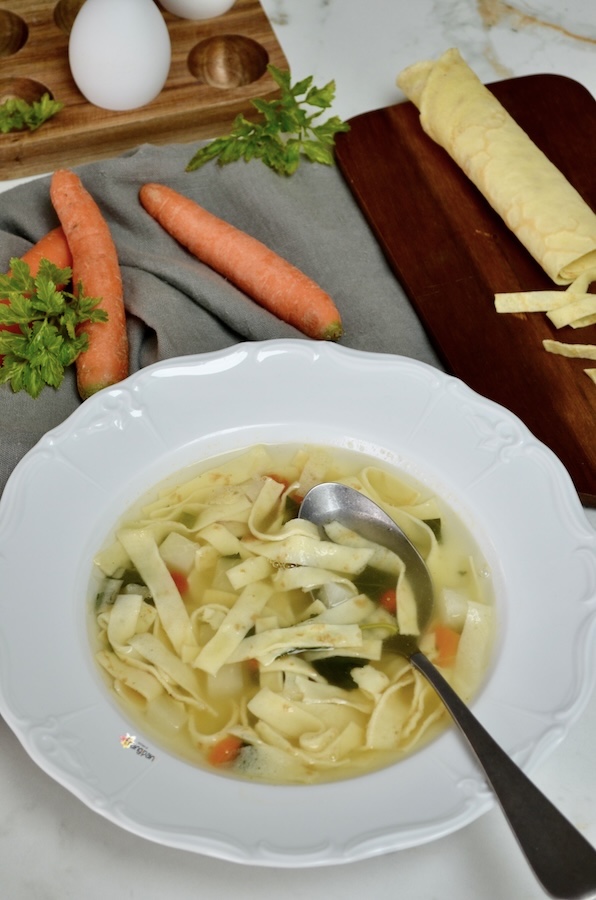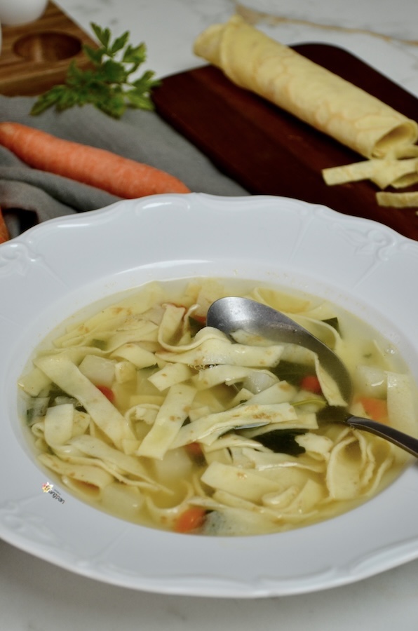Flädlisuppe eine etwas andere und leckere Art, Crêpes zu geniessen, und gleichzeitig ein hervorragendes, wärmendes Gericht. Dieses Gericht hat viele Namen: Flädlisuppe, Consommé Célestine, Frittatensuppe, aber im Grunde ist es immer dasselbe: in Streifen geschnittene Crêpes in Brühe.