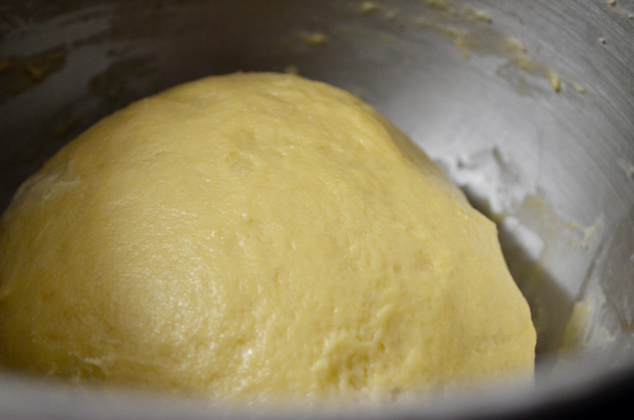 Mettete nella planetaria la farina, lo zucchero a velo, le uova, il tuorlo, i semini della bacca di vaniglia, l'acqua con il lievito sciolto dentro e 100gr di burro ed iniziate ad impastare. Quando vedete che inizia a compattarsi, aggiungete il sale. Lavorate per 1min a velocita media, poi aggiungete il resto del burro poco alla volta. Fate impastare la planetaria finché l'impasto non si sarà staccato completamente dalle pareti della ciotola e quindi sarà perfettamente incordato. Formate una palla e mettetelo in una ciotola bella grande.