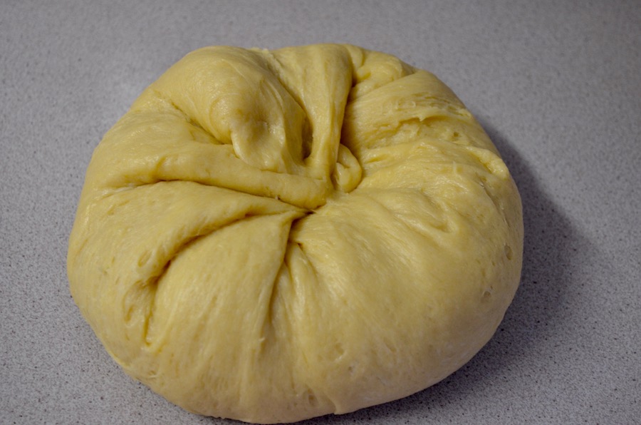 A questo punto fatelo lievitare a temperatura ambiente per tutta la notte ben coperto. La mattina dopo uscite l'impasto dalla ciotola e con le dita stendetelo leggermente formando un disco. Poi piegate l'impasto: prendete una parte del bordo e schiacciatela al centro del disco, procedete tutt'intorno in senso orario. Ripetete questa operazione una seconda volta.