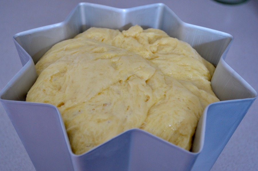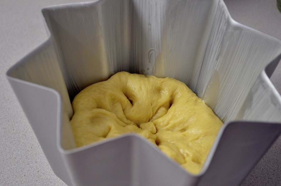 Imburrate bene lo stampo per Pandoro e fate cadere l'impasto sul fondo con le pieghe verso l'alto. Coprite bene e fate lievitare finché l'impasto non arriverà fino al bordo, ci vorranno ca. 4-6 orette, dipende dalla temperatura.