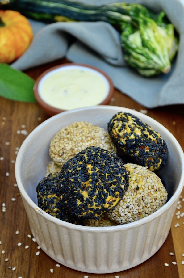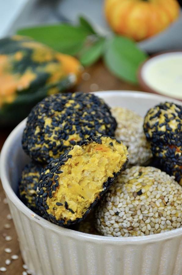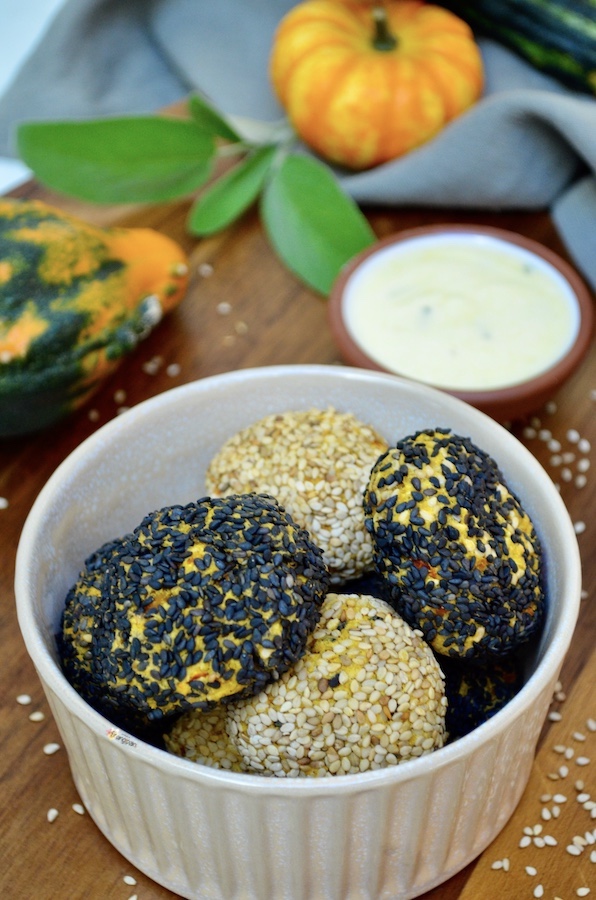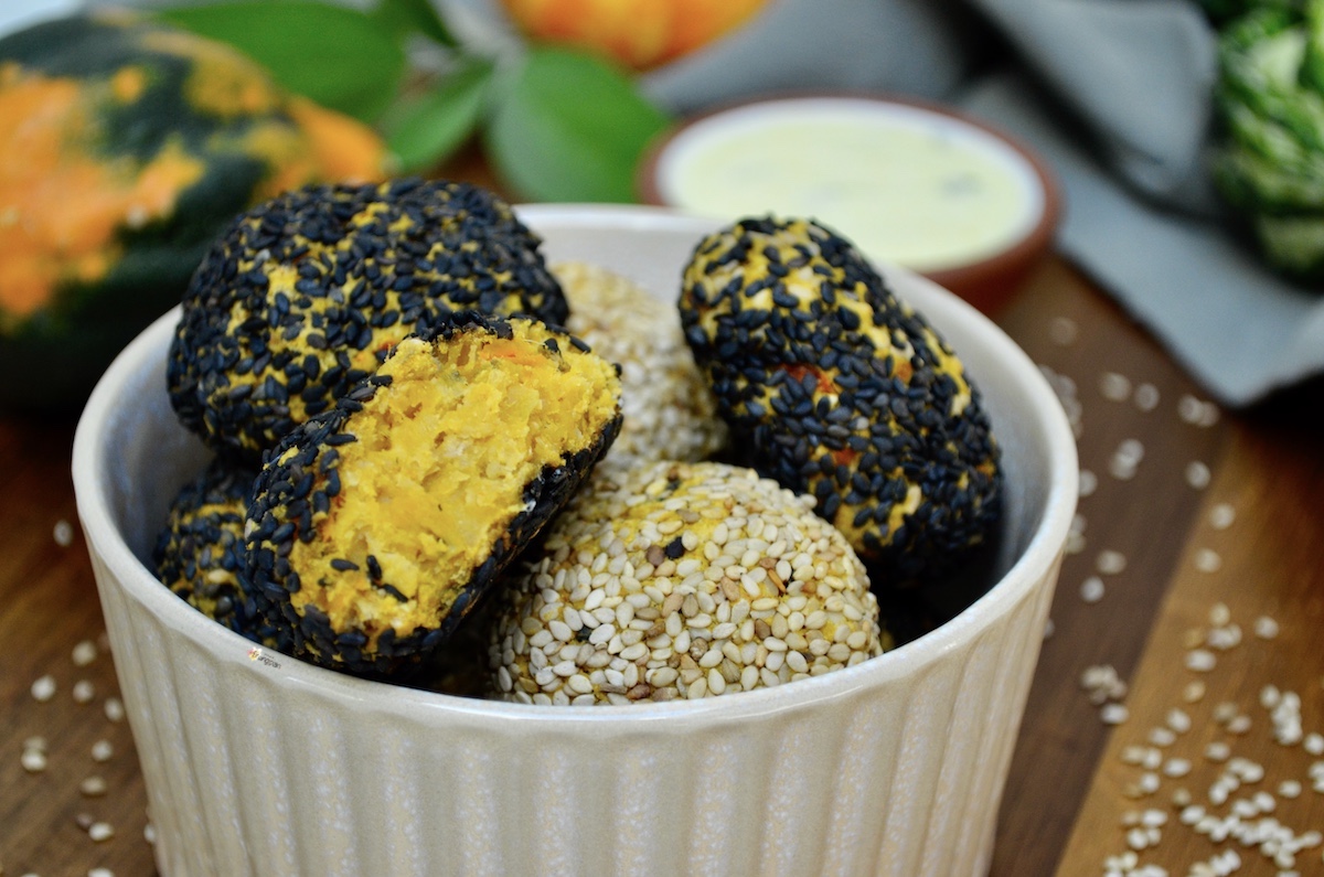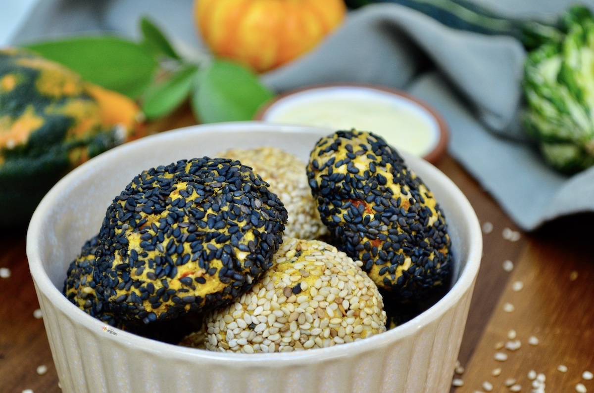 Pubblicità: Polpette vegane di Zucca e Ceci con Crosta di Sesamo in collaborazione con Farmy. Delle sfiziose polpette vegane croccanti fuori e morbide dentro. Perfette per nascondere zucca e ceci, per tutti quelli a cui non piacciono. Ottime da mettere nella schiscetta insieme a una bella insalata o della verdura e una fetta di pane. Si possono arricchire con le spezie e le erbette che preferite, io ho messo curry e salvia. Ma anche solo con la salvia sono ottime. Ho servito il tutto con una salsa allo yogurt... È semplicemente dello yogurt bianco condito con senape, succo di limone, olio evo, sale e erbette.