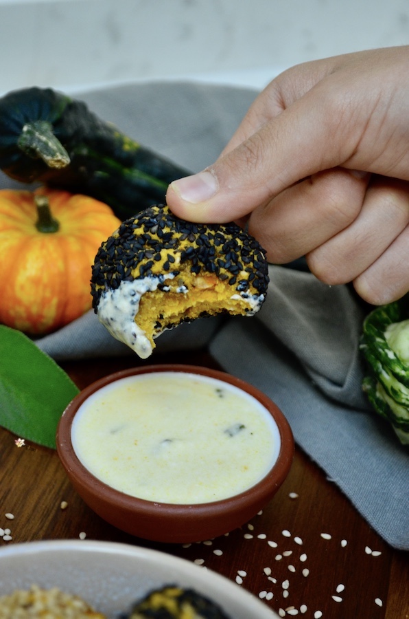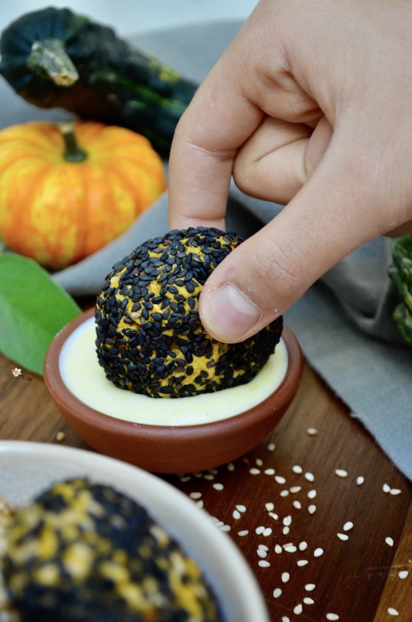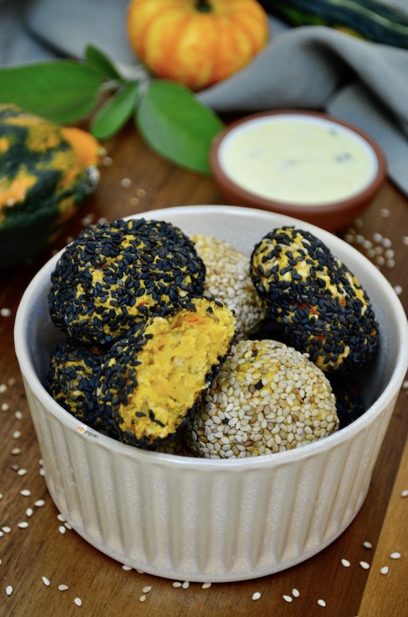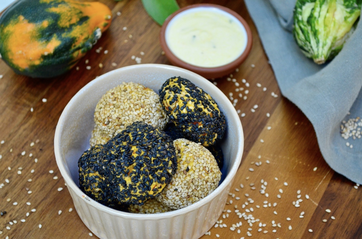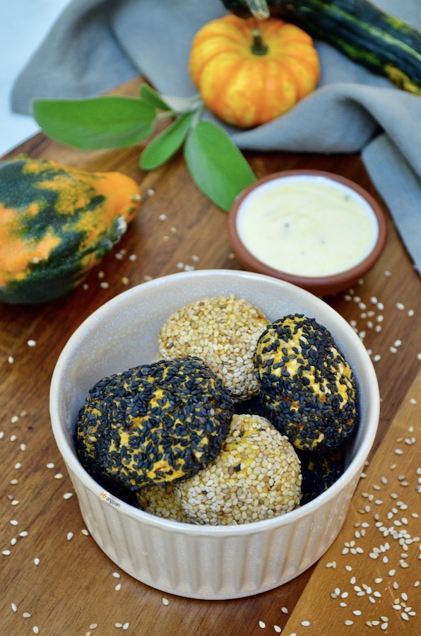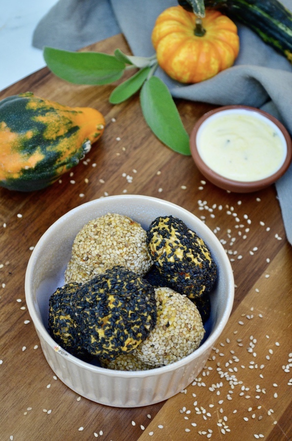 Pubblicità: Polpette vegane di Zucca e Ceci con Crosta di Sesamo in collaborazione con Farmy. Delle sfiziose polpette vegane croccanti fuori e morbide dentro. Perfette per nascondere zucca e ceci, per tutti quelli a cui non piacciono. Ottime da mettere nella schiscetta insieme a una bella insalata o della verdura e una fetta di pane. Si possono arricchire con le spezie e le erbette che preferite, io ho messo curry e salvia. Ma anche solo con la salvia sono ottime. Ho servito il tutto con una salsa allo yogurt... È semplicemente dello yogurt bianco condito con senape, succo di limone, olio evo, sale e erbette.