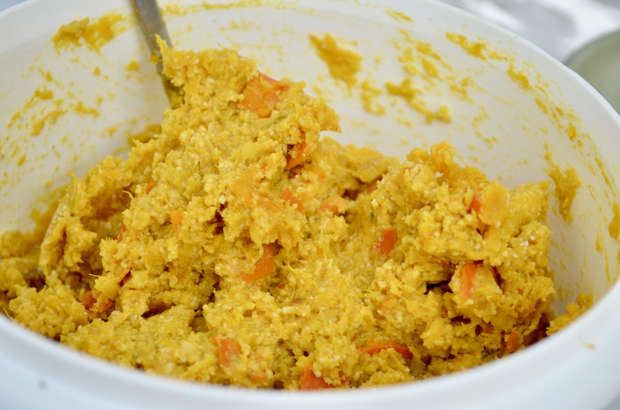 Scolate i ceci e sciacquateli bene, poi frullateli senza aggiunta d'acqua. La crema di ceci non dovrà essere liscissima, va bene anche un pochino grezza. Aggiungete ai ceci la zucca schiacciata e mescolate, aggiungete anche la farina di ceci e il pangrattato e amalgamate bene. Il composto dovrà essere bello sodo e modellabile, quindi se c'è bisogno aggiungete altro pangrattato.