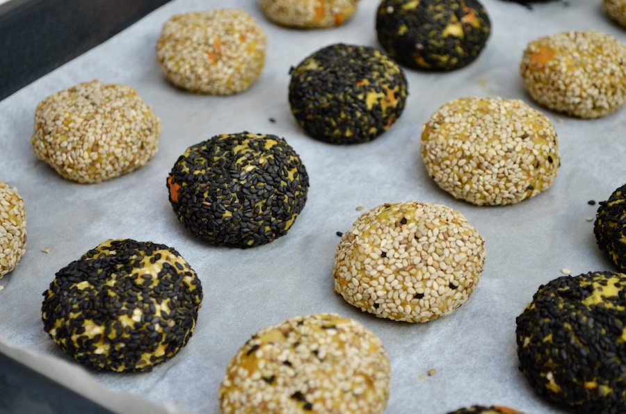 Versate del sesamo in una coppetta (io ho fatto due coppette, una con sesamo bianco e l'altra con sesamo nero, potete anche mischiarli). Prendete una cucchiaiata del composto di zucca e ceci e formate una pallina. Mettete la polpetta nella coppetta con il sesamo e fate aderire bene il sesamo su tutta la superficie. Poi appoggiate le Polpette vegane di Zucca e Ceci con Crosta di Sesamo su di una teglia con sotto della carta forno.