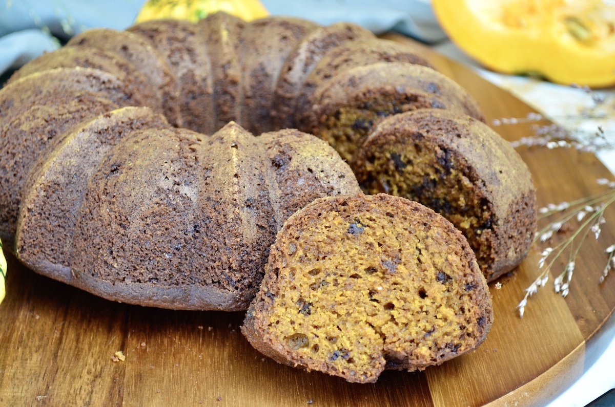 Kürbis-Schokoladen-Kuchen ein weicher, fluffiger Kuchen, der auf der Zunge zergeht, gefüllt mit Schokoladenstückchen. Dank des Kürbispürees wird der Kuchen schön saftig und sehr locker. Dieses Mal wollte ich weder Zimt noch Pumpkin Spice hinzufügen, sondern nur eine Spur Vanille, um den Kuchen neutral zu halten und die Aromen von Kürbis und Schokolade hervorzuheben. Aber nichts hält dich davon ab, auch mit Gewürzen schmeckt er köstlich.