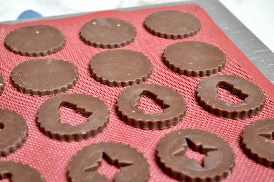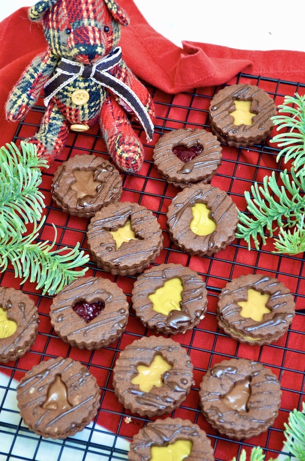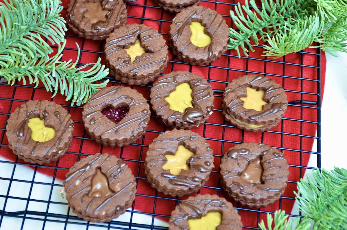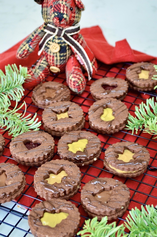 Lasst die Schokolade vollständig trocknen, nehmt dann eine Füllung eurer Wahl, verteilt diese auf einem Keks ohne Loch und verschliesst ihn mit einem mit Schokolade verzierten Keks.