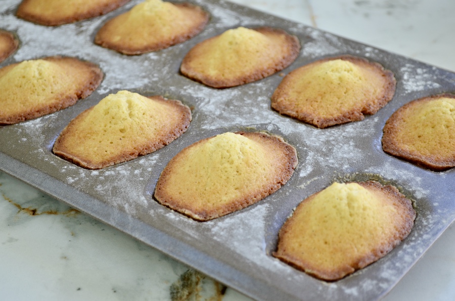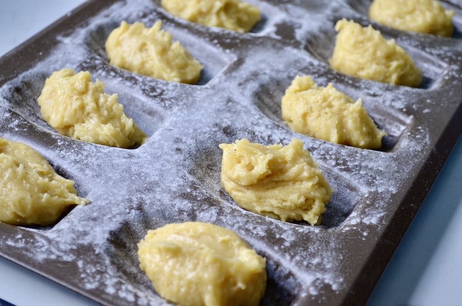 Imburrate e infarinate la teglia per Madeleines, prendete l'impasto e con l'aiuto di due cucchiai mettete una cucchiaiata scarsa di impasto in ogni incavo. Non deve essere pieno, perché comunque gonfieranno durante la cottura.