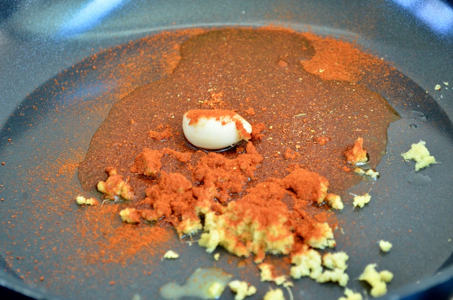 Lavate il cavolo cinese, tagliatelo a metà per il lungo e poi a pezzetti da 2cm circa eliminando il torso. In una padella mettete un abbondante filo d'olio, lo spicchio d'aglio intero o tritato, lo zenzero pelato e poi grattugiato, la paprika e se volete anche il peperoncino. Fate soffriggere a temperatura media finché non sentirete il profumo delle spezie, quindi aggiungete il cavolo cinese. Mescolate bene, fate rosolare un attimo poi aggiungete il concentrato di pomodoro, un cucchiaino di sale e mezzo bicchiere d'acqua.