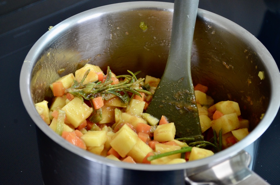 Per prima cosa prepariamno tutte le verdure: pelate e tagliate finemente la cipolla (o un pezzo di porro) e tenetela da parte. Poi lavate e pelate le carote e le patate e tagliate le carote a pezzettini piccolini e le patate a cubetti. Lavate il sedano e tagliatelo finemente. Mettete la cipolla, l'aglio intero o tritato e il rametto di rosmarino in una casseruola con un abbondante filo d'olio e un pizzico di sale e fate soffriggere. Eliminate l'aglio se lo avete messo intero, aggiungete le verdure precedentemente tagliate e il concentrato di pomodoro. Fate rosolare un attimino, poi aggiungete acqua o brodo vegetale fino a coprire tutto.